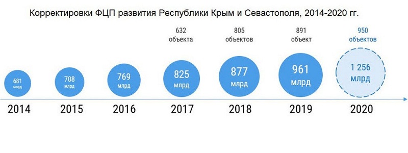 Министерство экономического развития России внесло в правительство РФ предложение о продлении федеральной целевой программы развития Крыма и Севастополя до 2024 года, увеличив ее финансирование практически на треть. Проект предусматривает рост бюджета ФЦП на 295,6 миллиарда, до 1,256 триллиона рублей, из которых 1,189 миллиарда предлагается выделить из федерального бюджета.