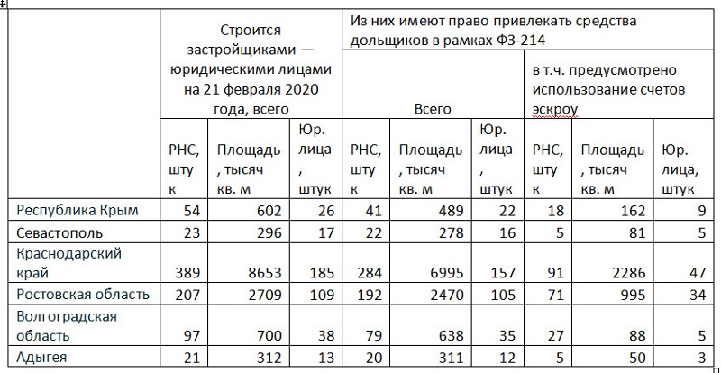О том, как подготовились к переходному периоду строители Крыма и Севастополя, можно судить по приведенной ниже таблице с данными по основным регионам ЮФО из Единой информационной системы жилищного строительства Минстроя РФ.