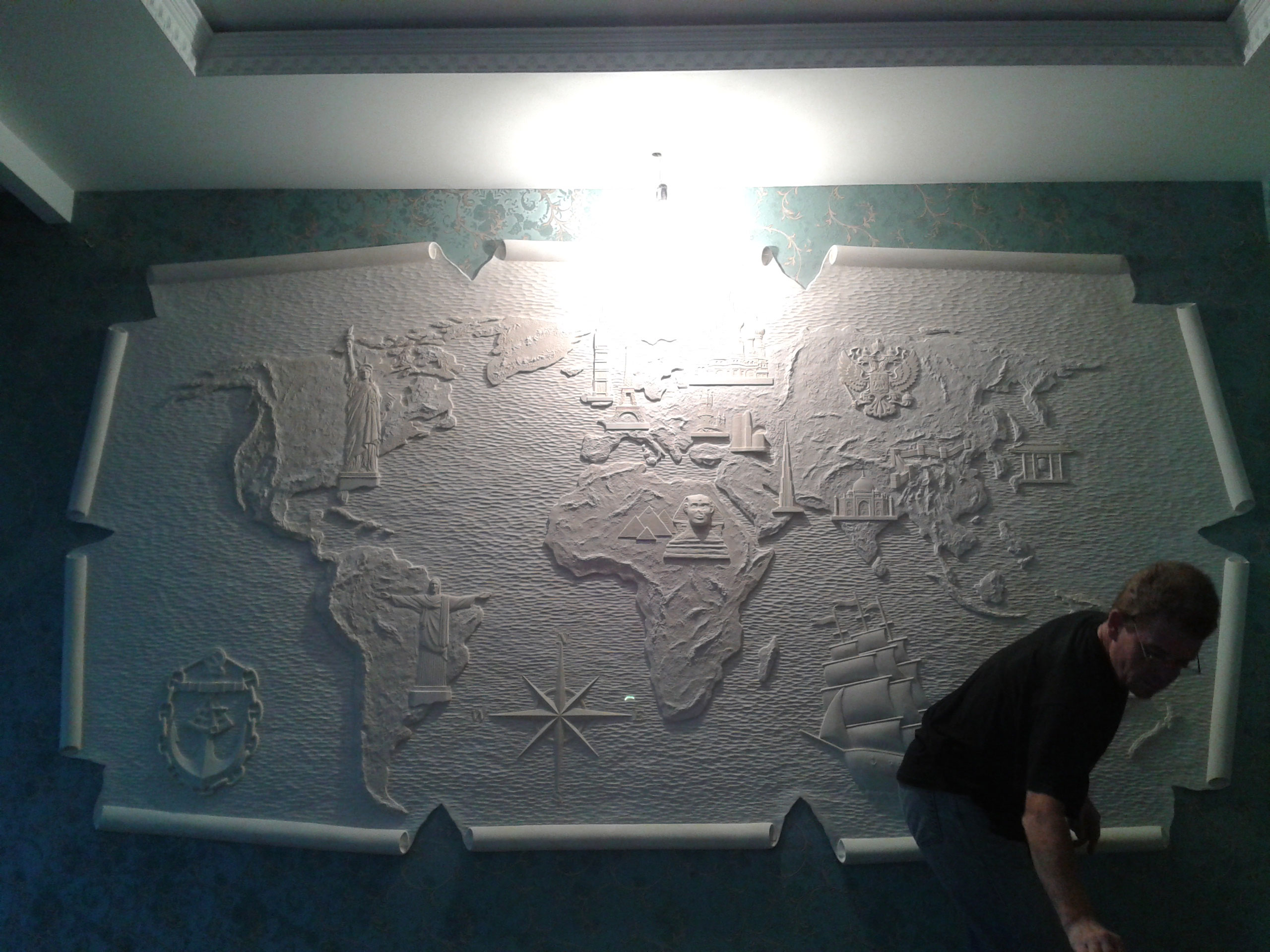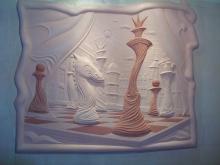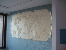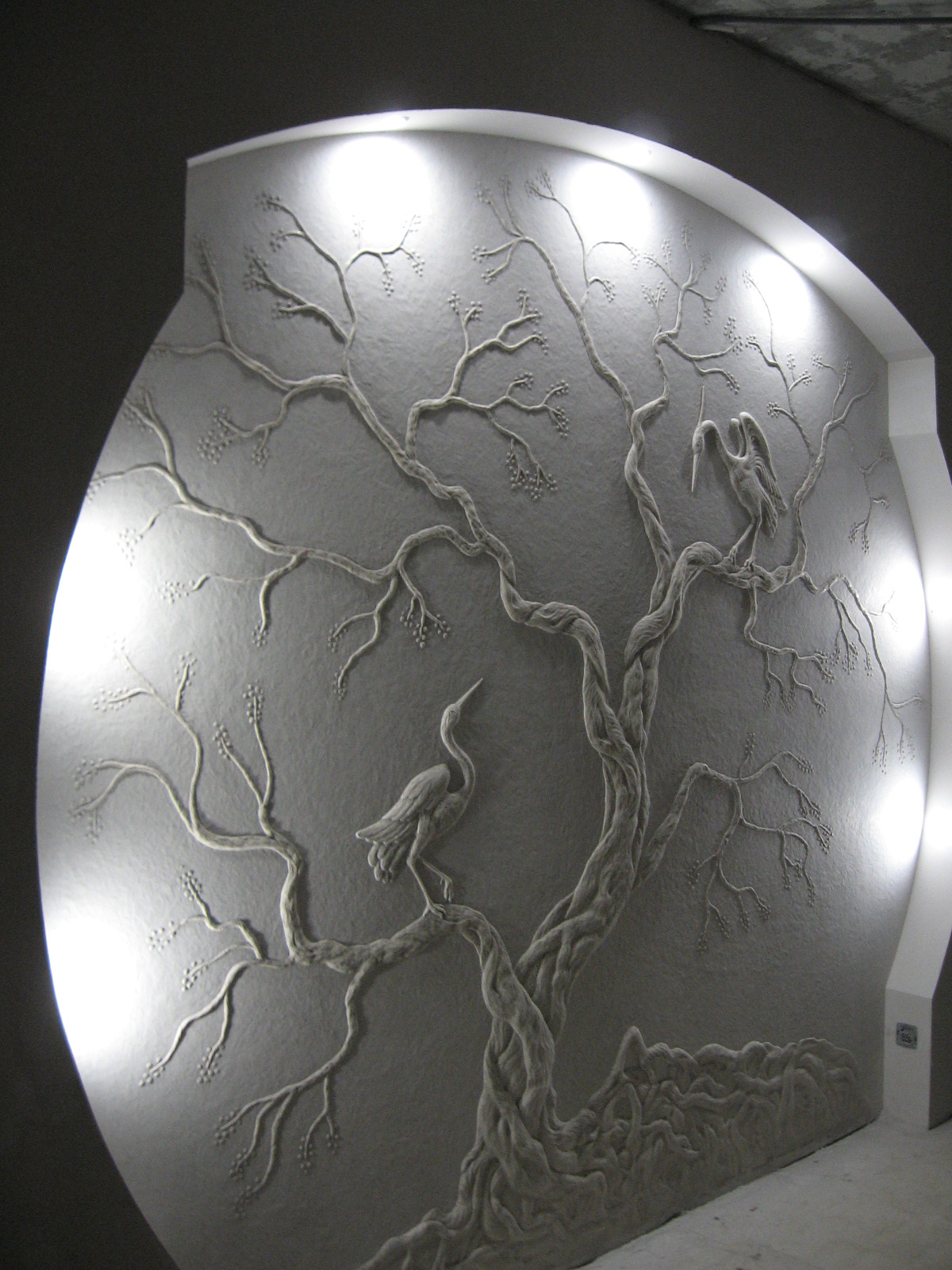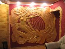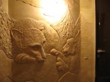Здравствуйте! Я занимаюсь изготовлением барельефов из гипса на любую тему. Изготовление непосредственно на стене или другой поверхности. Цена зависит от объёма и сложности рисунка.